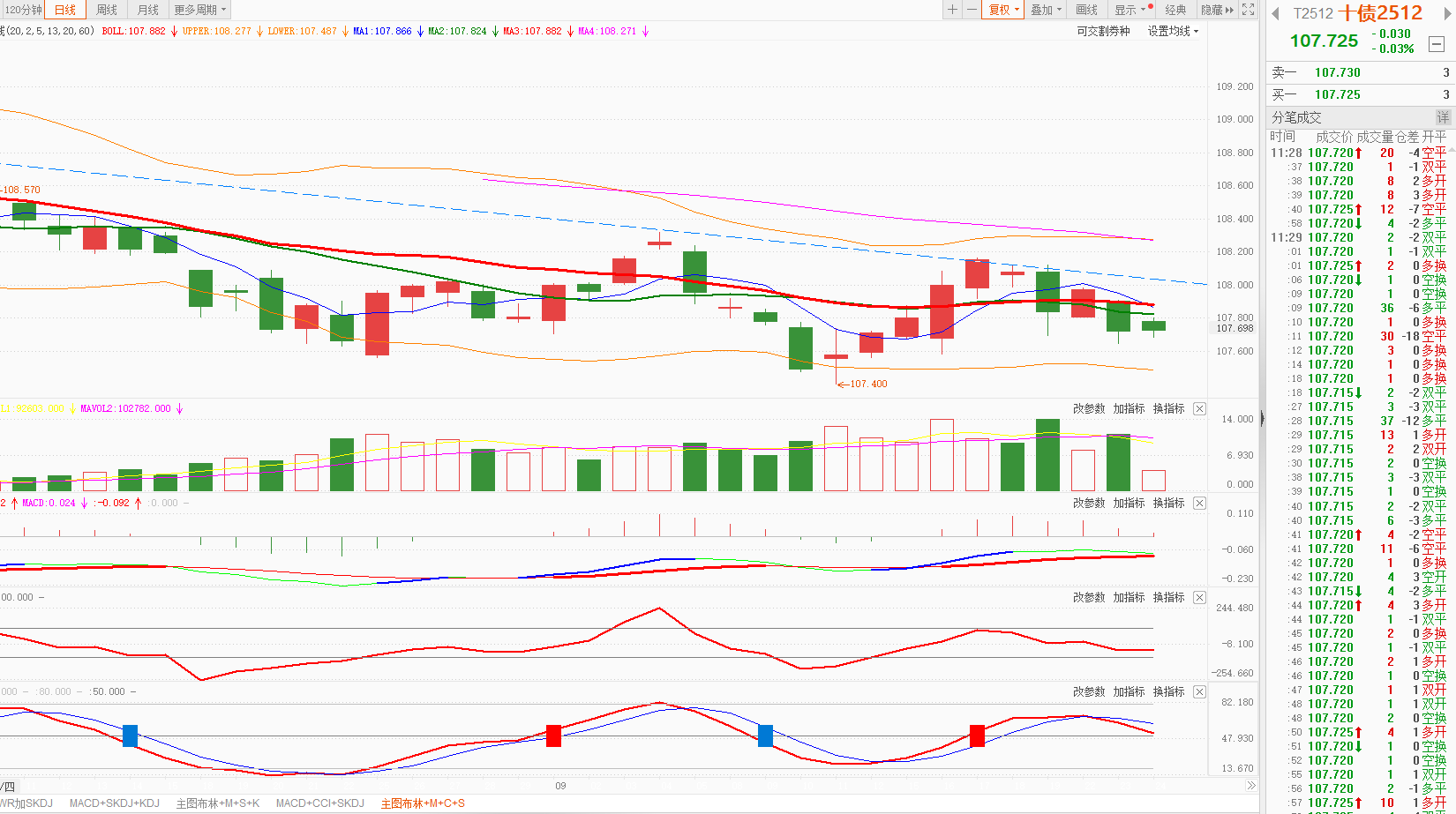 今天国债期货日K线收盘后全部在5、10、20日均线之下,整体走势震荡偏弱。