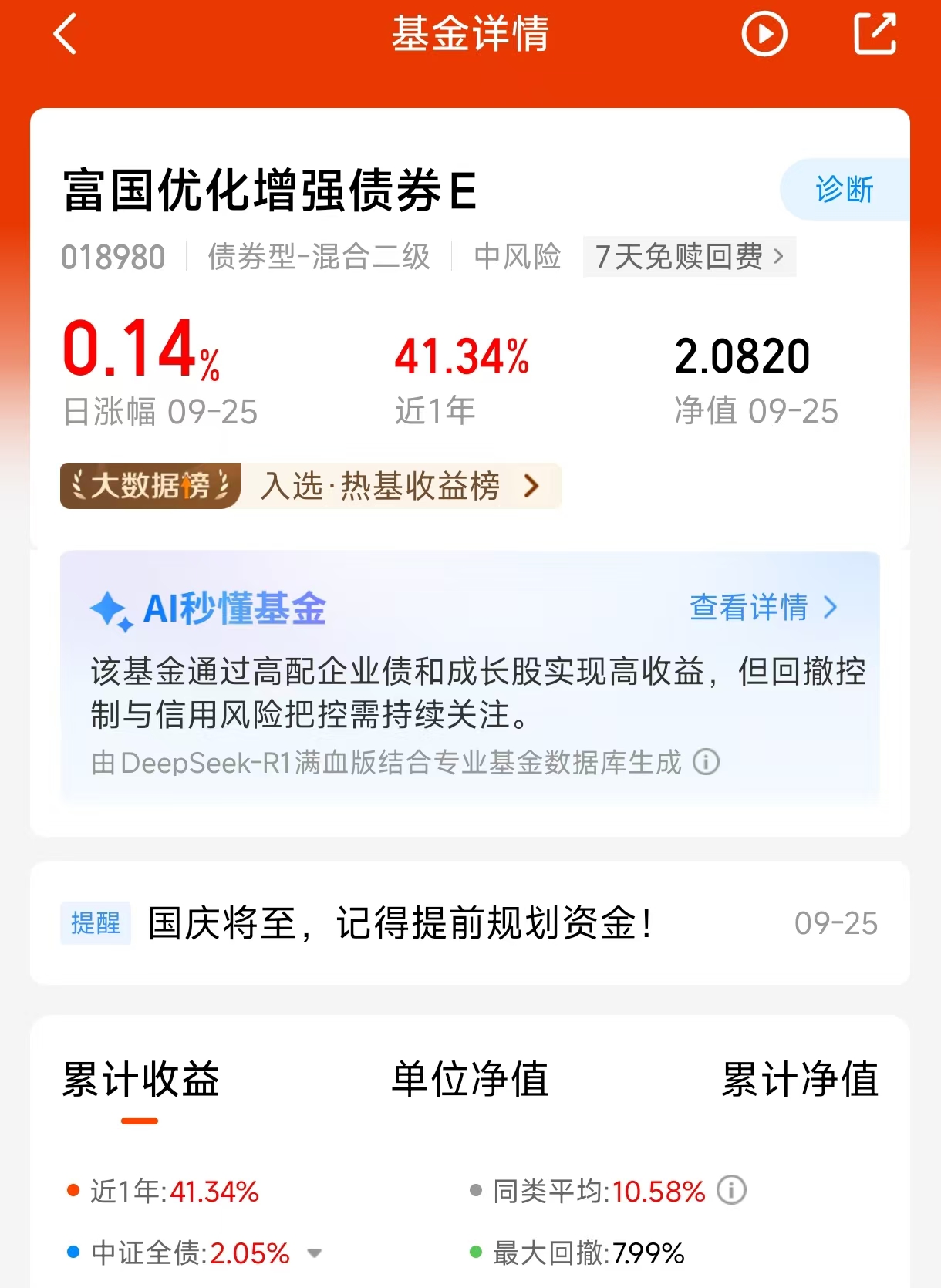 看了下持仓,一堆股基都在大幅震荡,反而比较好的是$富国优化增强债券E$(018980),感觉今天还可以加一点。主要这个真的稳,我拿了快一年也赚了41%多,比一些股基还好点。今年固收+趋势真的来了,买别的债一年撑死10个点,买股动不动跌个十几二十个点。我看数据这个一年最大回撤不到8%,这两天调整其实也不算大,收益率还不低。#林园:A股仍处牛市前夜#