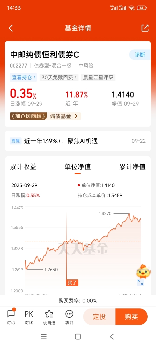 $中邮纯债恒利债券C$只投可转债和纯债,波动比普通混债小,适合纯债用户过渡。0.