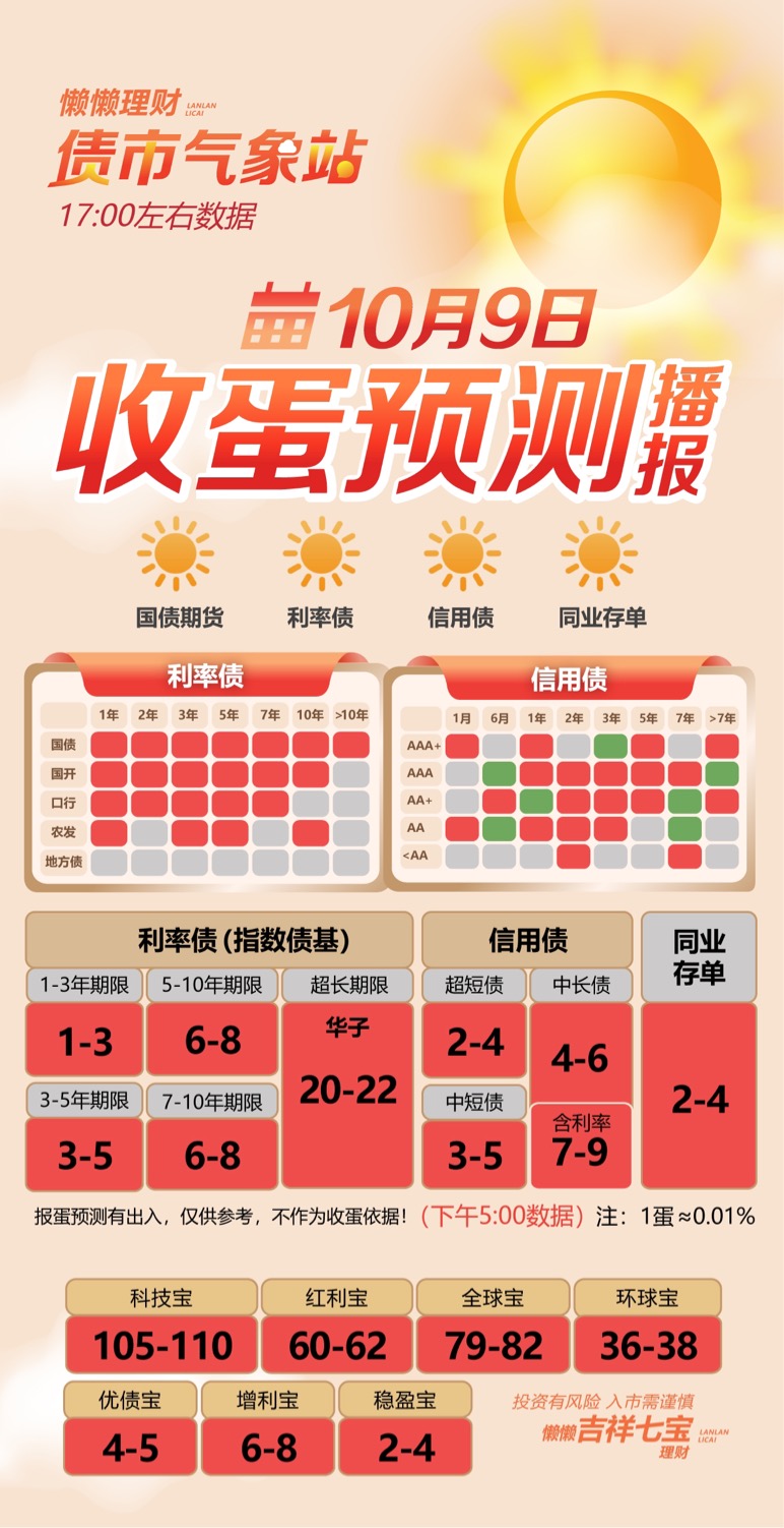 10月9号收蛋预测,股债喜迎10月开门红。假期多项数据不及预期,基本面弱现实依旧支持债市表现,叠加全球市场避险情绪升温,债市涨势显著。