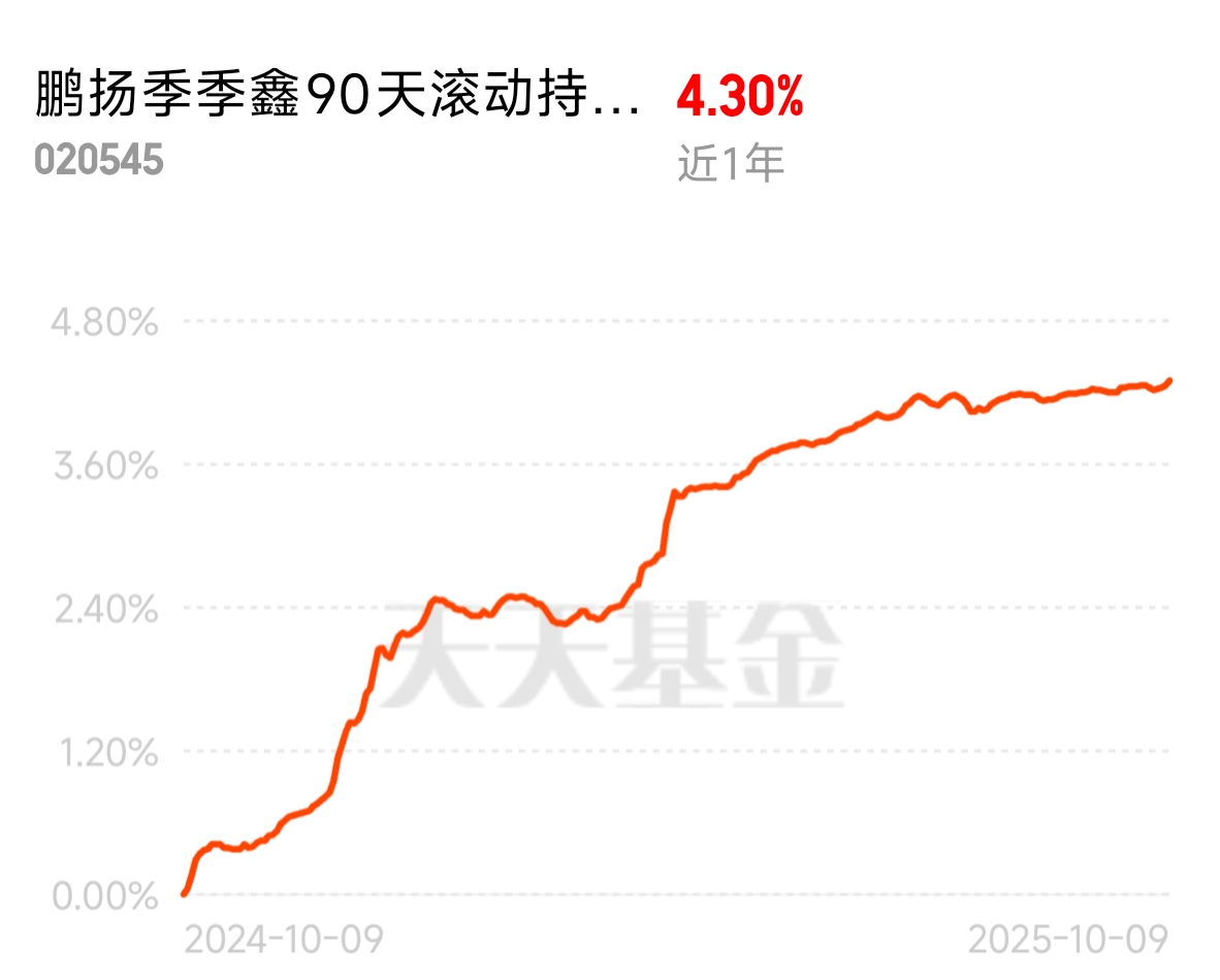 $鹏扬季季鑫90天滚动持有债券A$连涨4天,债市逐步企稳了,昨天收5个蛋,今年已
