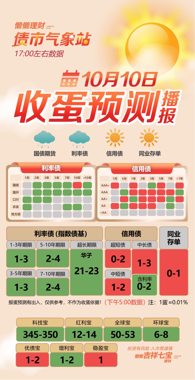 10月10号收蛋预测,股债开门红后今日双双走弱,债市情绪仍受压制,市场博弈国债买卖重启预期,机构预计央行买债与基金费率新规孰先落地,决定着多空双方对于10月债市定价的话语权。