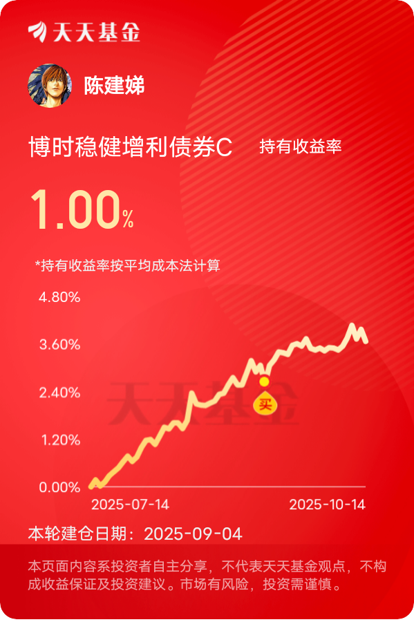 市场每天起起伏伏,关键得看长期,$博时稳健增利债券C$ 三个月的业绩有3.67%,半年下来收益稳稳站在了6.6%以上,其持续赚钱能力非常出色。这只基金的债券部分一直坚持“灵活久期+适度杠杆”策略,之前债市调整时就及时降了久期,风险控制做得很到位。最近有两个利好消息非常关键,一是9月制造业 PMI 虽然还在收缩区间,但政策发力的信号很明确,市场对宽松预期在升温,而债券收益率往往会跟着政策宽松往下走,这基的中长期债券后续有望获得资本利得。二是它的权益仓选得真准,基金经理早就在布局 AI 应用和机器人板块,这两周科技股反弹,正好给产品收益加了buff。债基的核心价值就是“压舱石”,博时稳健增利的票息收入能保证基础收益,权益仓又能捕捉市场机会,加上现在央行持续呵护流动性,市场情绪正缓慢回温,债市震荡上行趋势已显。这只基金风控到位,波动小,净值曲线一直走得很平稳,拿在手里放心。当前小幅回调正是机会,我打算再加一笔,看好四季度行情。#稀土价格暴涨37%!稀土板块狂飙# #晒收益#
