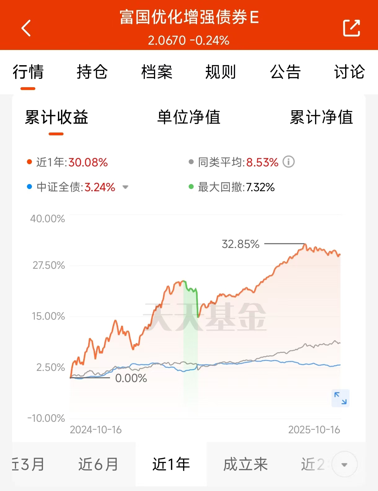 标准的,好的债基是什么样的?其实就是拿一个是波动小的品种做底仓,在配一点能抓股市机会的。你像有些就不会抓机会,今年都快负了,我觉得$富国优化增强债券E$(018980)和$富国久利稳健配置混合E$(019370)这种就挺好,近一年收益30%和50%,最大回撤也比沪深300小,既有股基的弹性,又有债基的特性。拿着个来搭一下行情来了不会错过,整体波动也不会太大,其实很合适。#机器人新催化?马斯克构建“世界模型”#