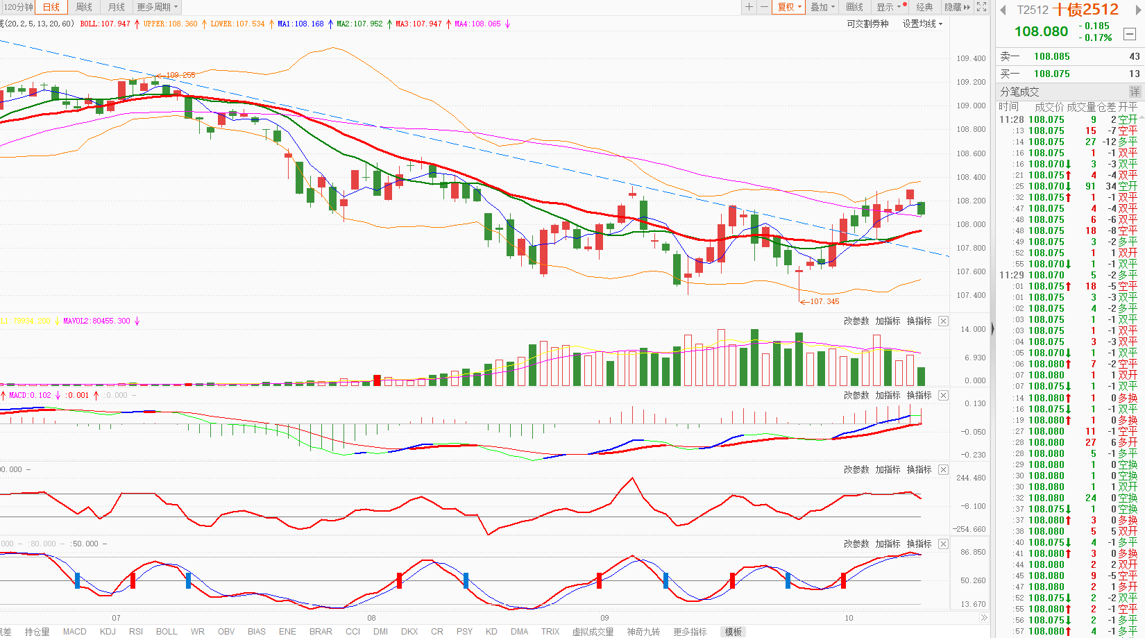今天2、5、10年国债期货日K线收盘后在5日均线之下,30年国债期货日K线收盘后仍在5日均线之上,整体低开低走,走势较弱。