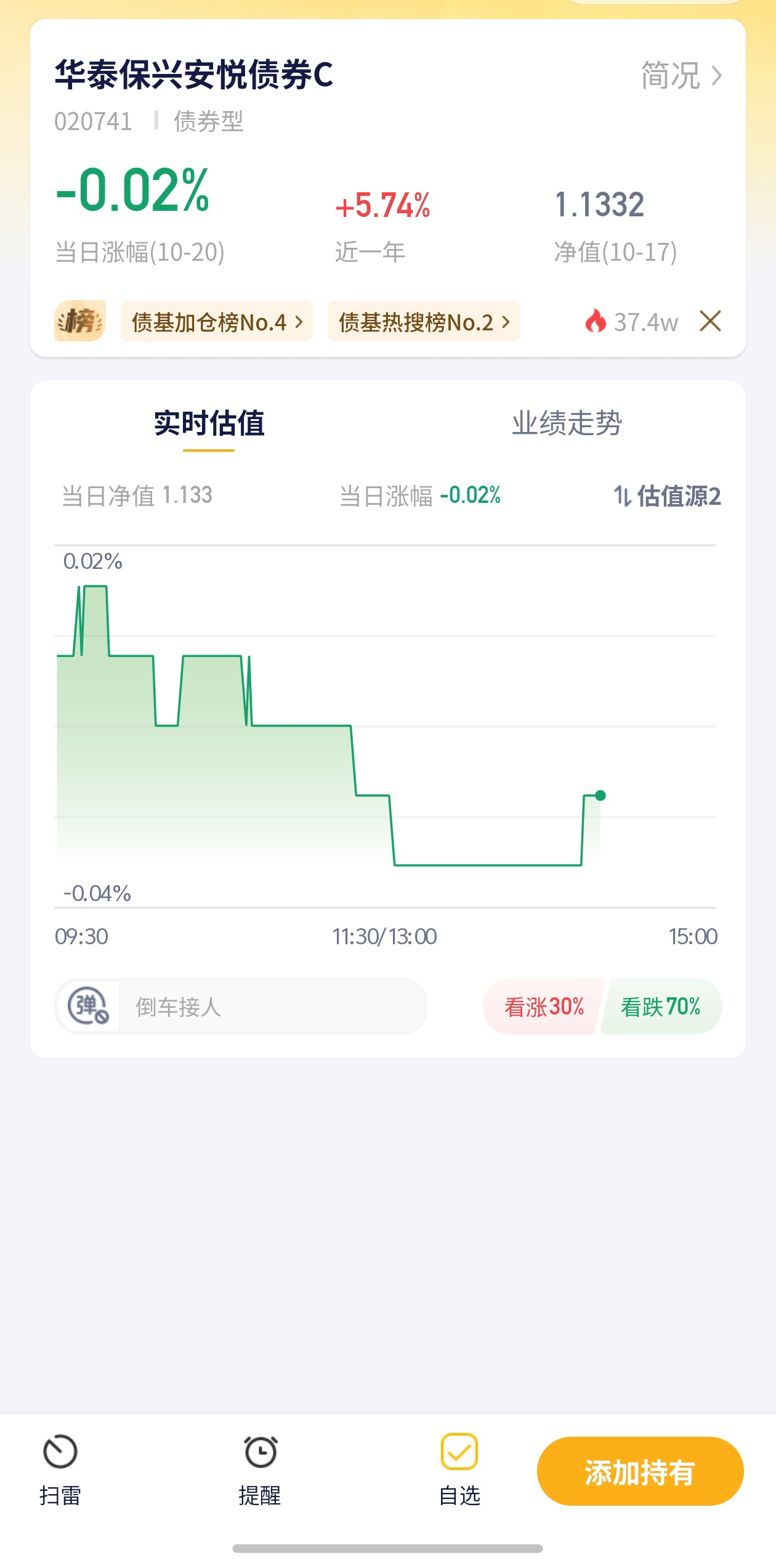 【华泰保兴安悦债券C估值播报+10月20日行情】华泰保兴安悦债券C估值-0.02%!债券基金今日整体平稳,追求稳健的你别错过~ 今天A股市场科技股反弹,数字经济、恒生科技基金估值涨幅可观,新能源板块也跟着上涨,新能源车电池、汽车指数基金都有不同程度的涨势,这两个板块今天的表现让投资者看到了机会,不过后续的市场变化还是要密切关注~
