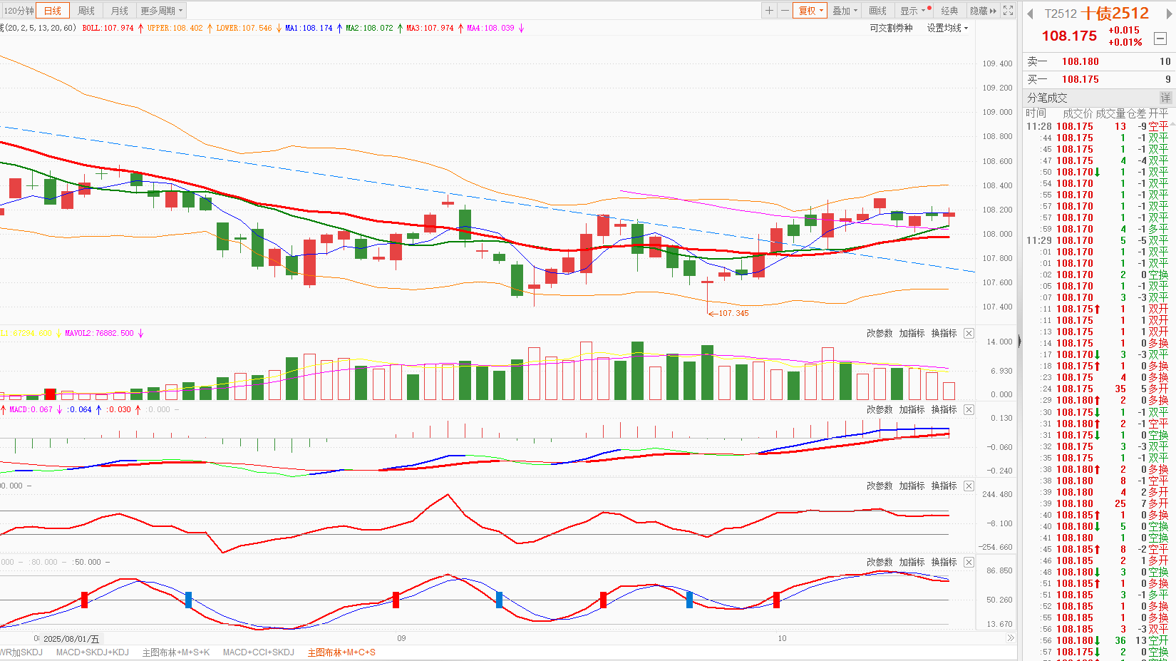 今天10年国债期货低开低走后震荡回升,总体涨0.01%,日K线在5日均线之上附近。