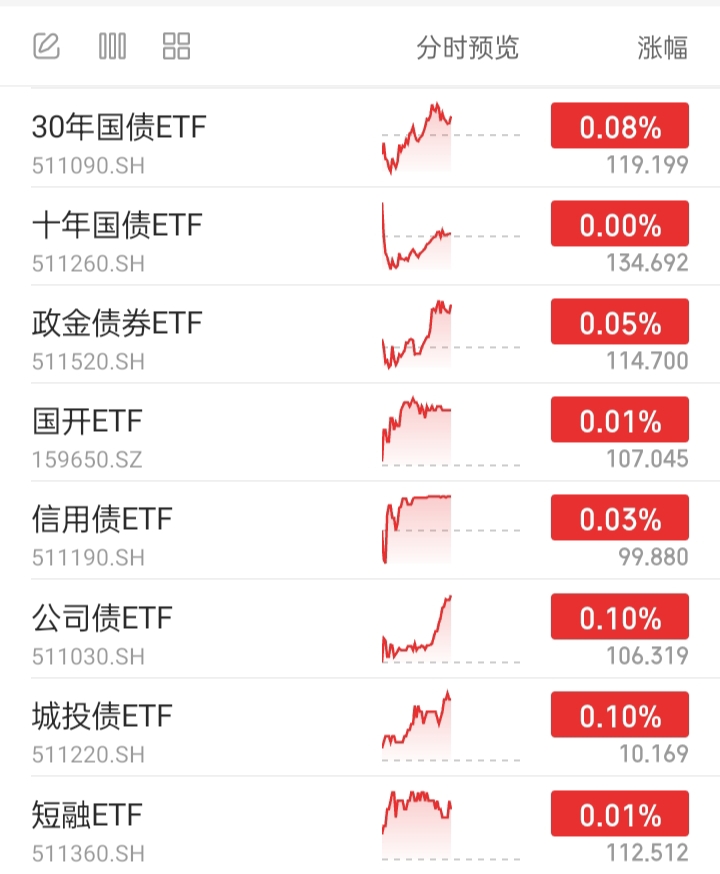 信用债ETF、公司债ETF、城投债ETF,代表信用债基。全部上涨