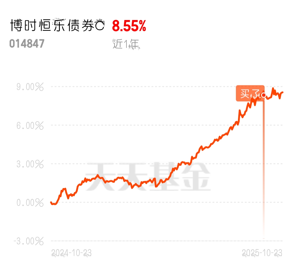 债市震荡上行的行情下,$博时恒乐债券C$ 准确把握住了机会,实现三连涨,三个月收蛋超过300个,近6个月更是实现了666个蛋的累计收益,夏普比率也很出色,说明风险调整后收益质量高。近期中美经贸摩擦带来了避险需求,从月底的APEC峰会到11月初的关税政策,市场不确定性挺高的,资金自然会往债券这种安全资产里躲。博时恒乐持有的债券占比超过八成,有不少高等级国债和产业债,这些都是典型的避险资产,资金涌入的时候,价格肯定会往上走,这波上涨的逻辑特别扎实。而且它的权益仓配置太对我胃口了,基金经理选的医疗创新和消费电子细分龙头,都是长期有成长逻辑的板块,最近虽然没暴涨,但一直在稳步回升,刚好能给收益添点料。加上还配了国泰中证全指证券公司ETF,既能分散个股风险,又能享受市场活跃度提升带来的收益。这种“避险债券+成长权益”的组合,让它在市场不确定的时候能稳住,回暖的时候能跟涨,再加上这基没有申购费,持有7天还免赎回费,其灵活性又能让投资者随时调整仓位,非常适合普通散户。#高盛看多A股:慢牛正形成 还有约30%上涨空间#