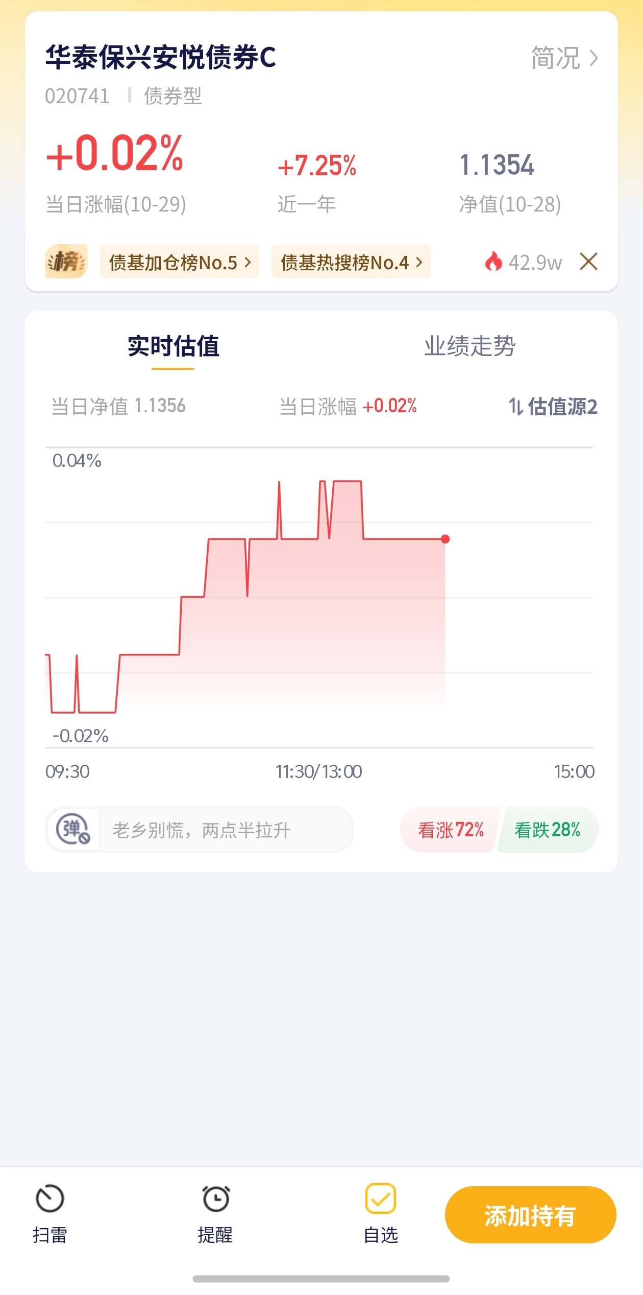 华泰保兴安悦债券C今日预估涨幅+0.02%!债券基金表现稳定,在自选中呈现微弱正向增长,较为稳健。