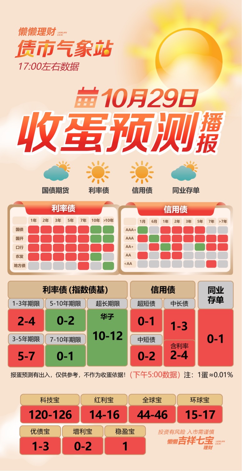 10月29号收蛋预测。债市结构性行情明显,尾盘再度转而上行,超长端进一步走弱,整体维持上有顶、下有底的震荡趋势。交易盘交替买入,尾盘券商再度转为卖出,银行为买方主力。