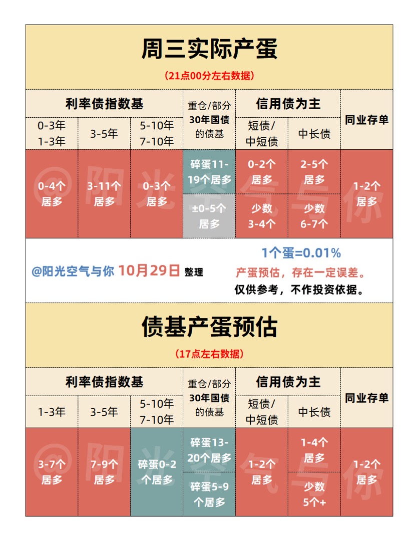 今天又赚了1000多!债市方面,主要是含30年国债基金碎蛋了,其他基本都是产蛋,少数0蛋。比阳光个人收盘预估的要好一些。