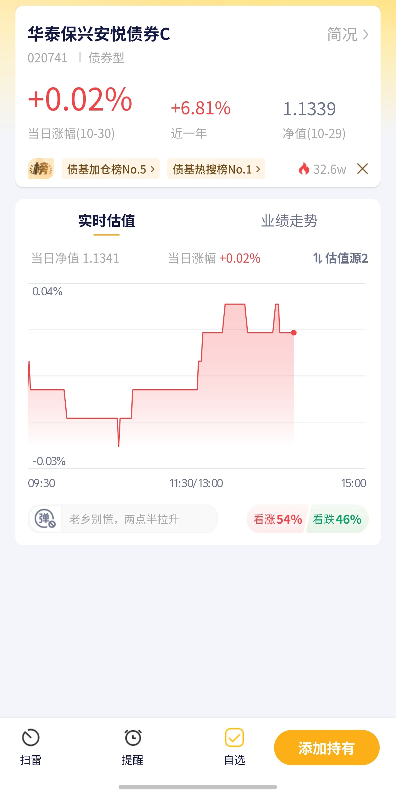 华泰保兴安悦债券C今日预估涨幅0.02%!债券市场表现稳定,该基金在自选榜中表现稳健。