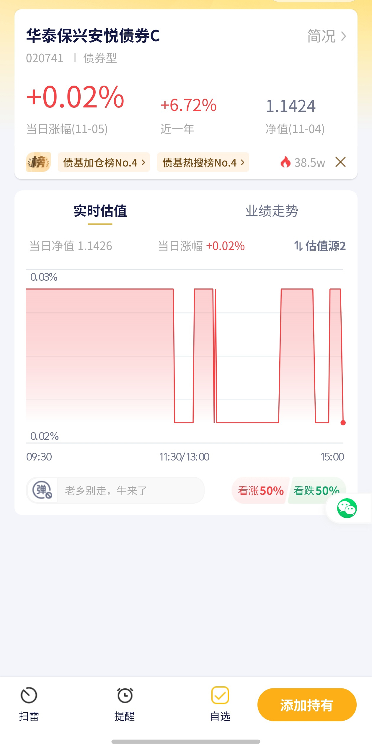 华泰保兴安悦债券C今日预估涨幅+0.02%!债券板块表现稳健,该基金领涨自选,还不错