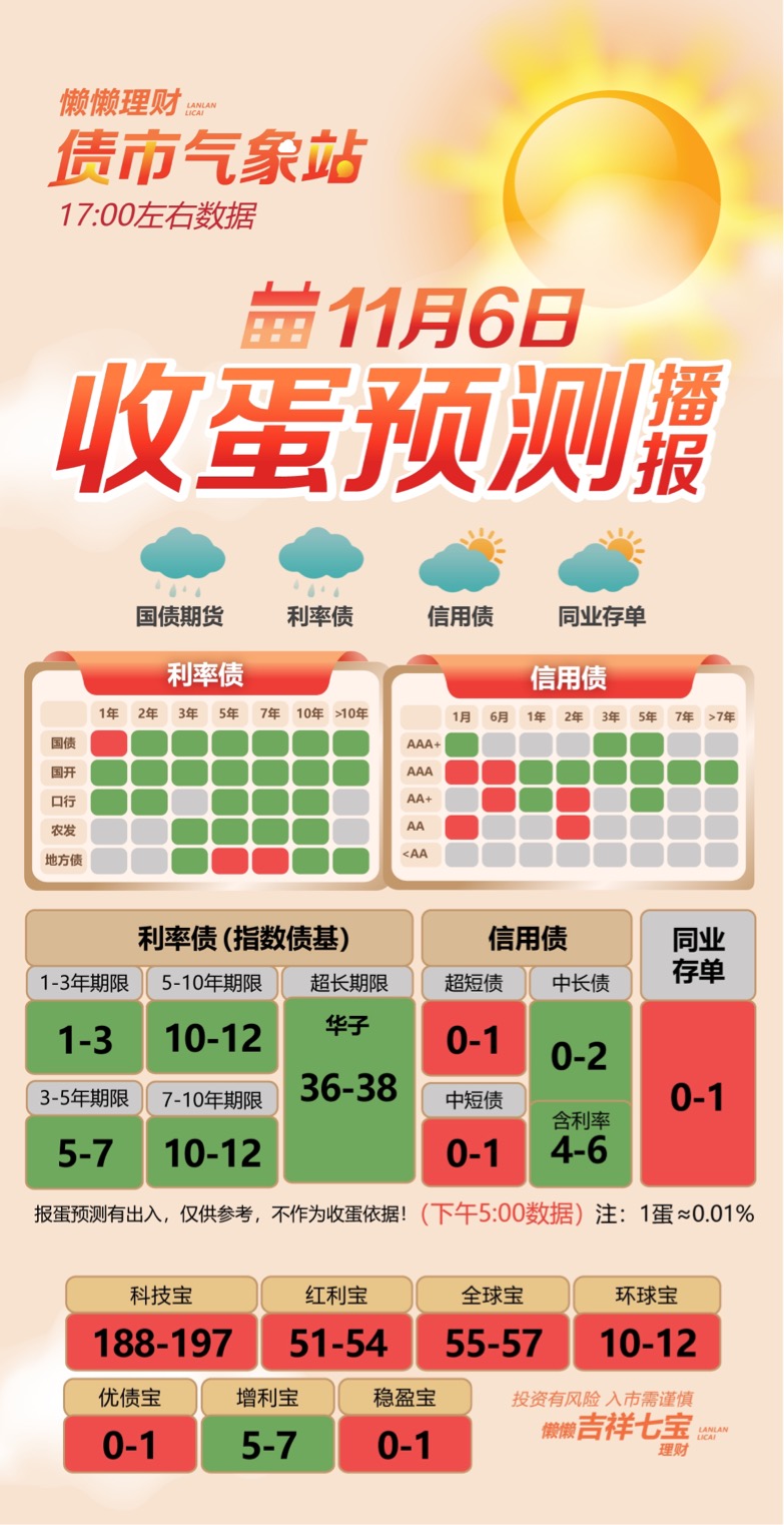 11月6号收蛋预测。债市今日走弱,止盈盘多增,现券收益率集体上行,短端上行幅度略小,盘中沪指重 上4000点,债市承压明显,基金新规或将落地,超长端回撤明显。
