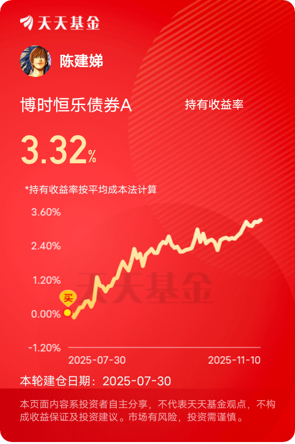 债市回暖,昨天$博时恒乐债券A$ 紧跟行情收蛋,到手7个。近期分红到手了30多块,这种定期红包太让人安心了,现在限额从单日1万升到500万,加仓能放开手脚了,操作也更灵活了。央行11月重启公开市场国债买卖,净投放200亿元的消息,对恒乐这种重仓利率债的产品来说简直是直接利好。这基的债券仓位里,政策性金融债和超长期特别国债占比较高,像24特国01、24特国05这些持仓标的,正好赶上央行呵护流动性的东风,不仅票息稳定,还能享受利率下行带来的资本利得,这也是它最近能连续收蛋的核心原因。再看它的权益部分,张李陵经理的选股很精准!这基的权益仓位聚焦高股息蓝筹和科技成长股,最近煤炭、石油石化这些高股息板块表现强势,正好契合它的配置逻辑,而消费电子板块的反弹也为收益添了把力。现在大盘高位震荡,很多股票基金让人提心吊胆,但恒乐这种“八成债券打底+两成权益增强”的策略太适合当下了当下市场了,债券部分有央行政策托底,权益部分又能蹭上热点板块红利,夏普比率2.84超越97%的同类,单位风险下的收益回报特别出色。现在大盘在4000点附近波动,布局时机不错!#工信部:深入实施“机器人+”应用行动# #晒收益#