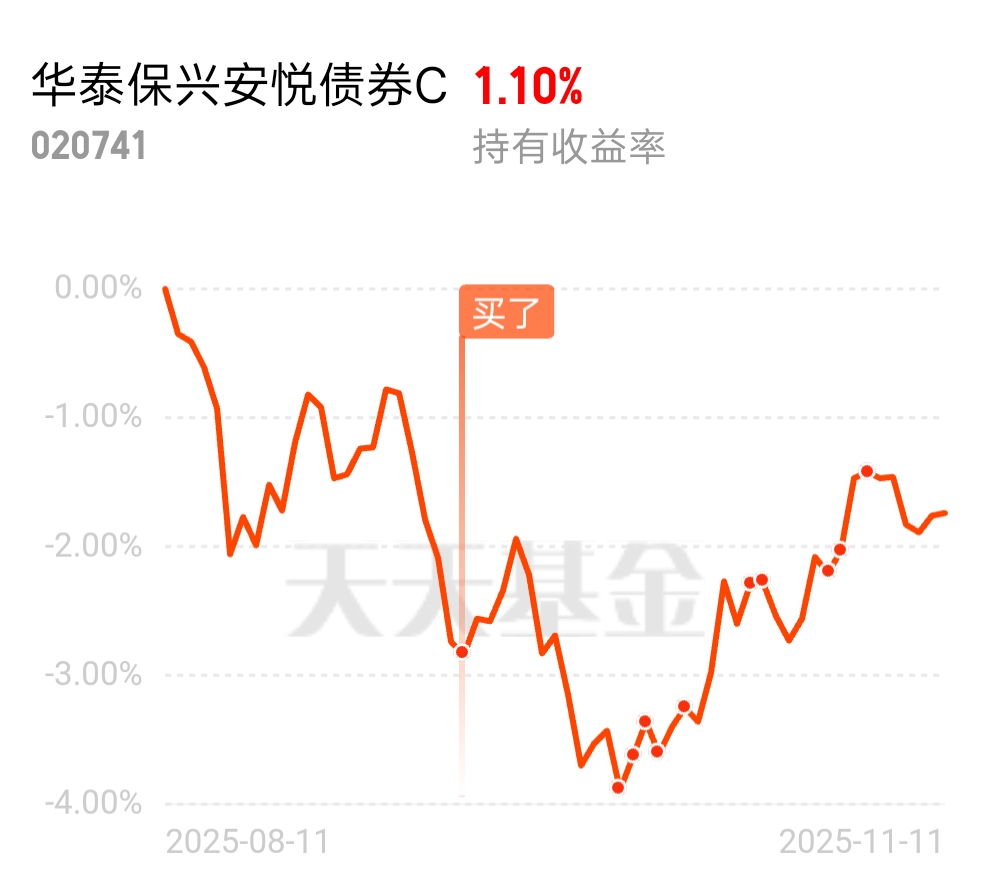 最近表现还不错,我的要求不高能稳稳的收蛋就行啊$华泰保兴安悦债券C$