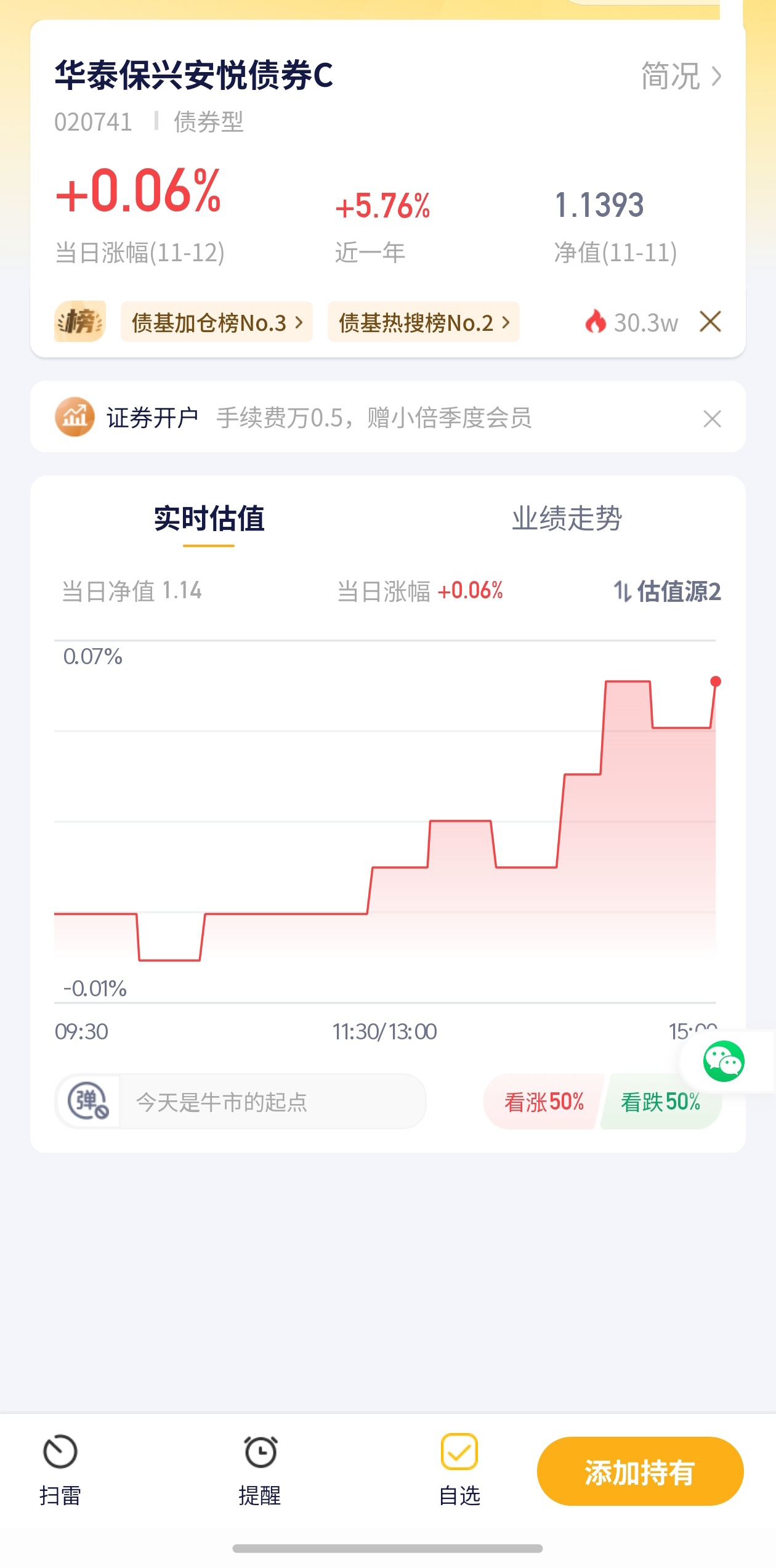 华泰保兴安悦债券C今日预估涨幅+0.06%!债券板块表现稳定,该基金领涨自选,还不错