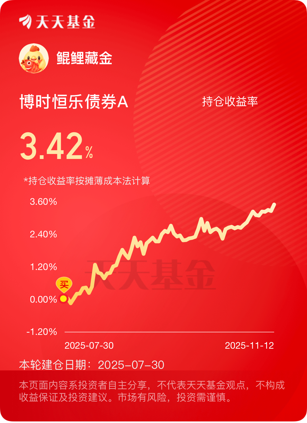 近期债市企稳,股市机会也不错,$博时恒乐债券A$ 单日涨了23个蛋,净值又往上窜了一截!还有它10月底的分红,我也小赚了一笔,到手40多。之前单日只能买1万,现在限额直接调到500万,方便了大资金的操作需求。现在政策面和资金面都利好债市,三季度货币政策报告明确说要实施适度宽松的货币政策,保持流动性充裕,后续债市大概率还有行情。这只基金的债券仓位占比超80%,其中大部分都是政策性金融债和超长期特别国债,刚好赶上了近期利率债的行情红利。而且这些债券还有免税优势,大部分都是2025年8月前发行的存量券,利息收入免征增值税,税后收益比新券高0.8%-1.2%,相当于给收益加了层buff,这也是为什么最近债市回暖,这只基金能快速跟上节奏。还有它的权益部分,仓位占比不到20%,重点布局了消费电子和新能源板块,前阵子加仓了宁德时代、兆易创新这些龙头股,刚好赶上了最近科技板块的反弹行情。尤其是消费电子,随着行业复苏和新品发布,相关个股表现强势,基金这部分持仓直接贡献了不少收益。而且基金经理在权益配置上很谨慎,单行业配置不超过5%,前十大重仓股占比不到10%,分散了风险,比很多纯债都要稳。#多重利好催化!新能源走强#