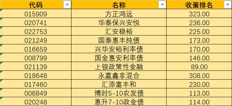 短期来看,债市行情仍然向好,所以我对于近期的债基收蛋能力也是想探索一下。扒了一下从930开始的收蛋情况,基本上是从回暖开启的。差距还是比较大的,就俩上了300,剩下的基本都落后60多个蛋也上。本来以为是方正和华子二人转,没想到第一是方正,第二是鑫享,华子落后的还是挺多的。$永赢鑫享混合C$ $广发中债7-10年国开债指数E$ $汇添富中债7-10年国开债E$