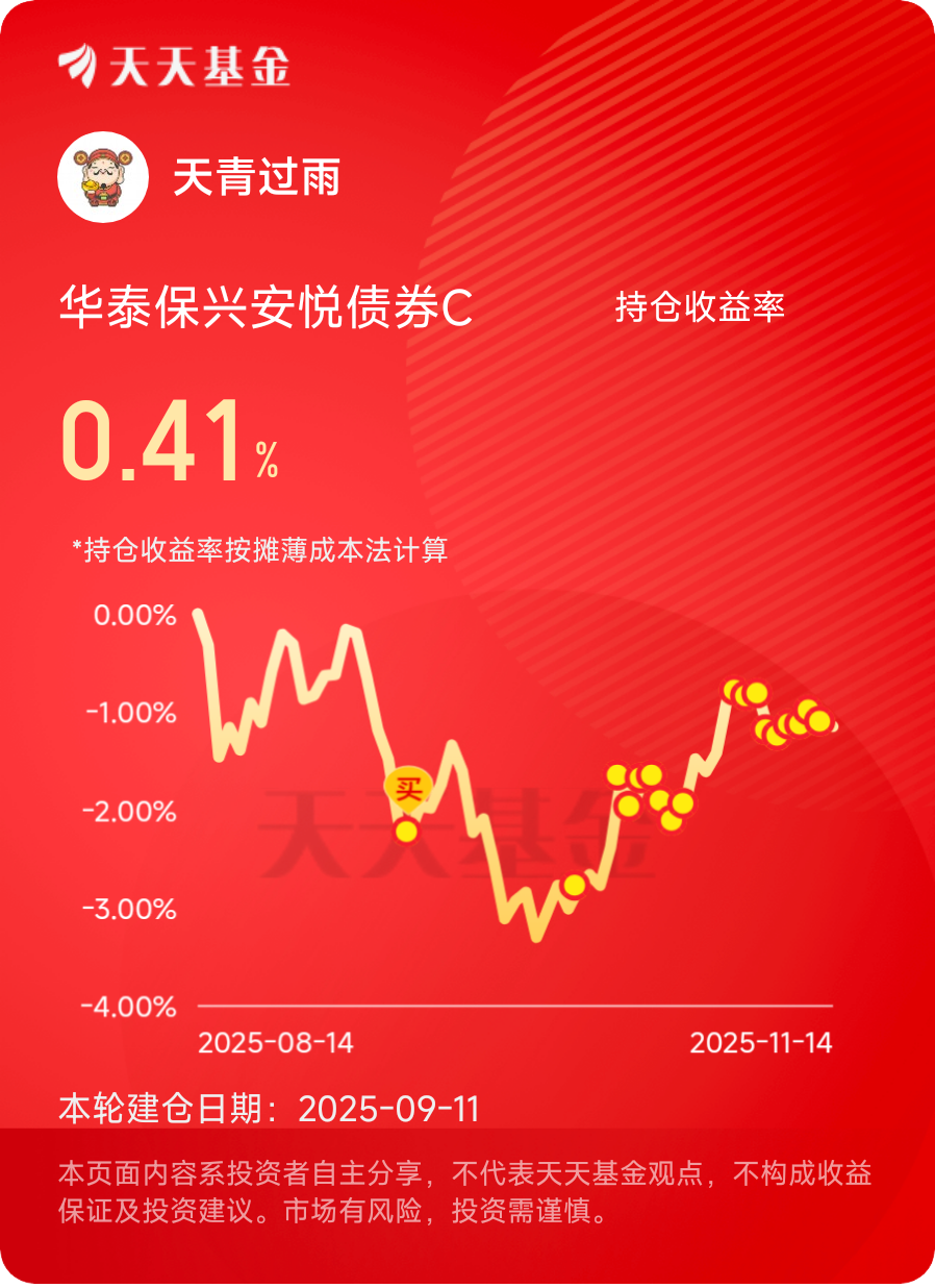 市场波动大,还是债基稳,放这里不求大涨稳稳收蛋就挺好$华泰保兴安悦债券C$ #晒收益#