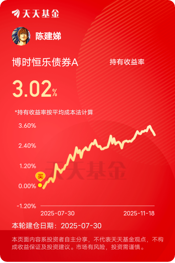 最近发现$博时恒乐债券A$ 在投资规则上做了一个非常友好的调整,单日申购限额从原来的1万元,提升到了500万元,这大大增加了基金的灵活性,资金进出方便了很多。不仅如此,最近它还进行了分红,我的咖啡钱直接就到账了,这种定期兑现收益的感觉特别好,同时也从侧面说明了基金的运作是健康且能持续产生收益的。10月底央行明确恢复公开市场国债买卖操作,这个信号太重要了,相当于央行直接下场托底债市,给市场注入长期流动性。而博时恒乐的债券仓位超八成,重点配置的就是政策性金融债和超长期特别国债,这些都是央行重点呵护的品种,收益率跟着市场稳步下行,债券价格自然上涨。再看它的权益仓位,这部分简直是锦上添花的神来之笔!占比在两成左右,但配置得特别精准,前十大重仓股里有世纪华通、兆易创新这些科技龙头,刚好赶上了11月科技板块的反弹行情。尤其是世纪华通,作为游戏和算力板块的核心标的,随着“十五五”规划强调“科技自立自强”,算力基础设施建设提速,近期股价稳步回升,直接给基金贡献了不少超额收益。现在股市在3900点高位震荡,这基可攻退可守,正是逢低补仓的好时机。#工信部推动算力建设!算力股机会来了?# #晒收益#