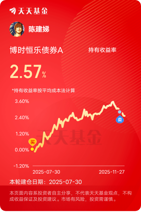 波动行情里,低波固收+拿着踏实,$博时恒乐债券A$ 债基底子稳,权益增强收益,六个月5.29%的收益,很自足了,加上十月份分红到手50多,持有体验很好!基金经理目光长远,最近限购从500万降到了100万,这规模控制得好了,业绩才更持久。这只基金的债券底仓太扎实了!基金主要配置了政策性金融债和超长期特别国债,这些债券不仅信用风险低,还能享受免税红利,税后收益比普通债券高出不少。尤其是近期央行重启暂停近10个月的公开市场国债买卖,当月净投放200亿元,这个信号太重要了!央行购债直接带动长端利率债需求上升,10年期国债收益率已经逐步下行,这只基的债券仓位正好能吃到这波红利。加上11月央行还加量续作MLF,市场流动性宽松,债券价格稳步上涨,这部分收益就很扎实。其权益仓位权益仓位也很给力!三季度在权益端布局了贵金属、风电油运这些细分景气板块,最近国际金价上涨,国内风电项目密集落地,这些板块都有不错表现,正好给基金净值添了助力。现在A股3800点附近,很多人担心追高风险,但这基的权益仓位是“小而精”的布局,既不会因为股市波动影响整体稳健性,又能在结构性行情中赚收益,逢低布局时机不错。#小摩:超配中国! 调整是买入时机# #晒收益#