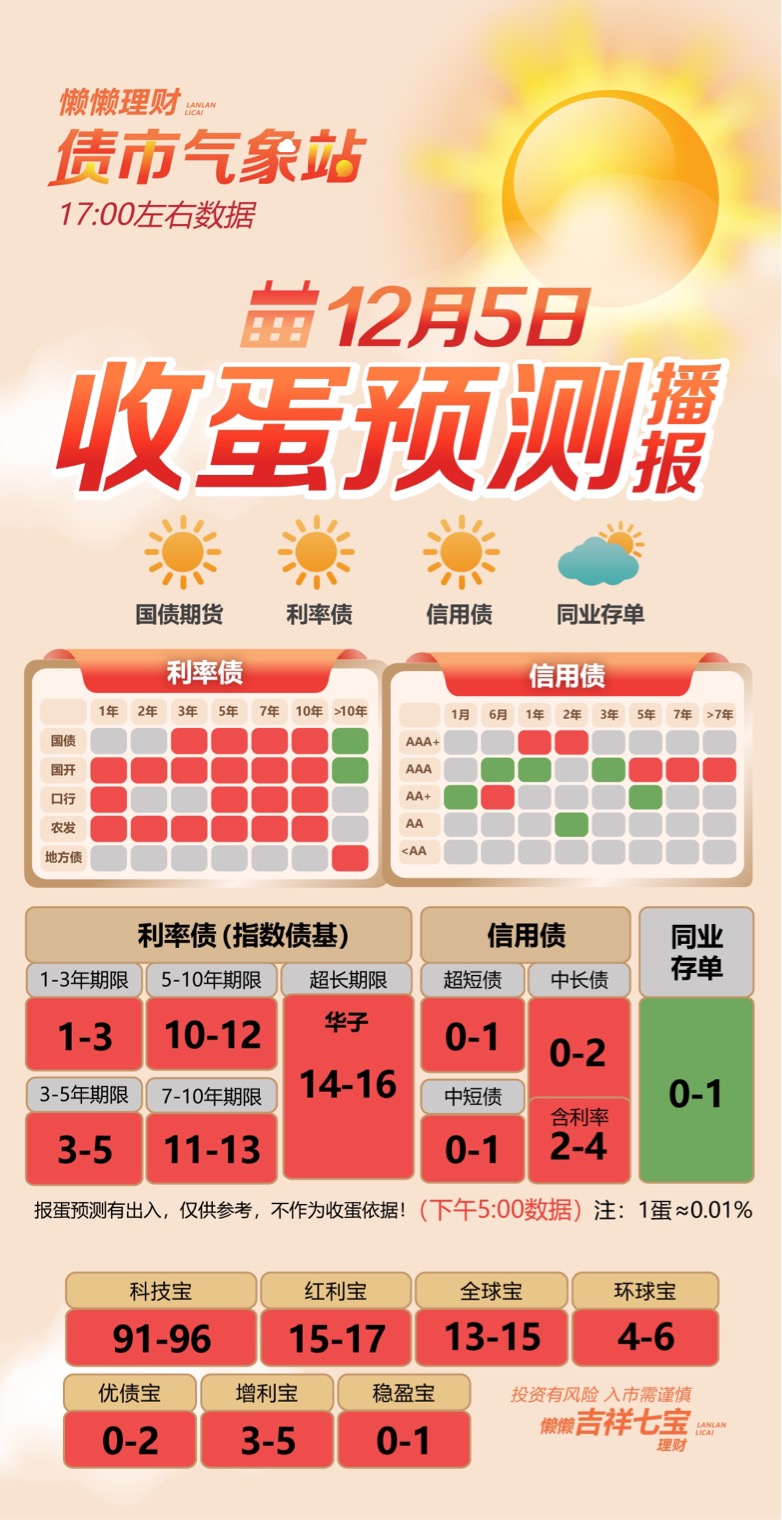 12月5号收蛋预测。今日债市情绪企稳,止跌反弹,现券收益率多数下行。券商、基金日内交替买入,中长端回暖明显。