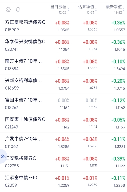 债基这边继续拉升,收蛋不错。。利率债表现很不错,10年期红0.9个BP,超长红1.5个BP以上,今天也是有蛋收的。信用债也是红多绿少,部分券种可以收蛋。来看看目前的估值情况,$方正富邦鸿远债券C$ 今天预估38-45个蛋,前几天涨了有超过100个蛋的时候,表现还是可以的。$华泰保兴安悦债券C$ 预估24-28蛋,表现也还行吧,在有点弹性就更好了。$方正富邦中证全指自由现金流ETF联接A$ 估6-9个蛋,0-5年的估2-5个蛋。现在看保险更偏好30年老券与50年老券,配置盘进场的情况下,超长端(尤其是老券)利率有机会再涨一涨的。
