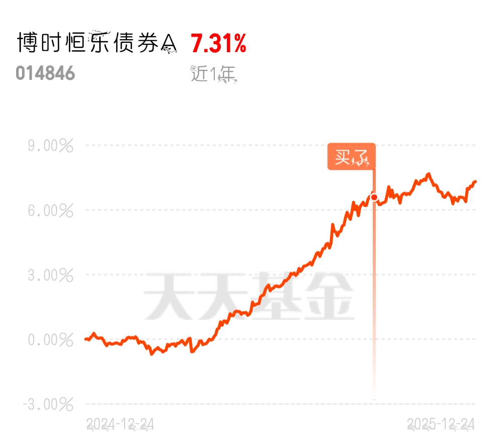 这阵子市场起伏反复,$博时恒乐债券A$ 却像一块压舱石,净值走得很稳,昨天收了3个蛋,半年下来积累了474个蛋的收益,业绩很能打。这基最近还把大额申购的门槛从500万降到了100万,感觉经理是想控制好节奏,细水长流,专心把净值曲线画得更漂亮。12月政治局会议定调的“宽财政+宽货币”政策,明确要保持流动性充裕、促进融资成本下行,这对债基来说就是最扎实的后盾。而且12月22日央行重启14天期逆回购,专门呵护跨年流动性,避免年末资金紧张,这直接保障了短端利率债的收益稳定性,而博时恒乐A的债券仓位里,政策性金融债、超长期特别国债等利率债占比超65%,正好精准吃到了这波政策红利。其权益仓位占比不超过20%,确是点睛之笔!既能增厚收益又不冒大风险,重点布局了高股息蓝筹股,像煤炭、石油石化这些板块,既能抗住股市震荡,又能拿到稳定分红。现在股市在3900点附近徘徊,正是布局好时机,既能靠债券打底稳赚票息,又能靠权益仓位赚点超额收益,坐等行情带飞就行!#新年观察局:2026我看好的投资赛道#