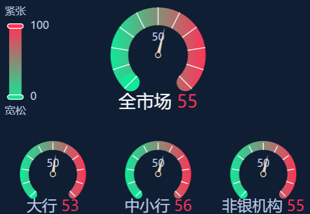 六、资金面情绪指数:全市场55 资金面趋紧 (0-100紧张度递增,50为均衡,超过50反映资金紧张)
