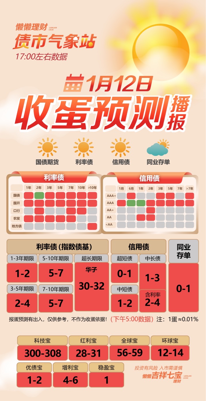 信用债方面,超短债收0-1蛋;中短债收1-2蛋;中长债收1-3蛋。同业存单收0-1蛋。