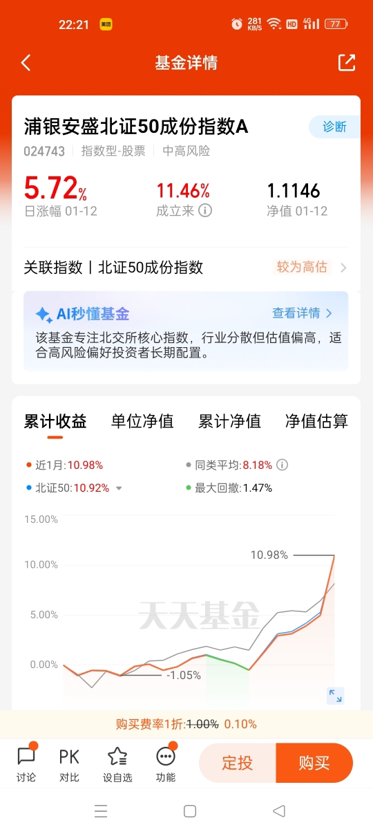 最近北证指数表现抢眼$浦银安盛北证50成份指数A$ 今天又大涨5.72%,额度充足,费率低,重仓专精特新的企业,值得拥有
