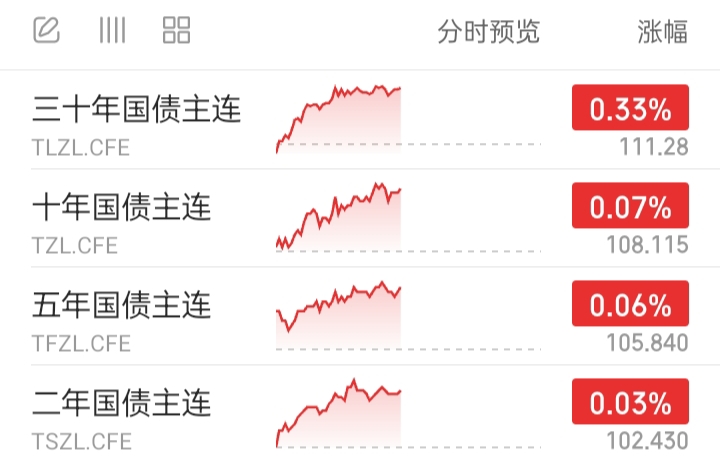今天国债期货日K线收盘后全部在5日均线之上,2、5、10年国债期货日K线收盘后在5、10、20日均线之上,整体走势较强。