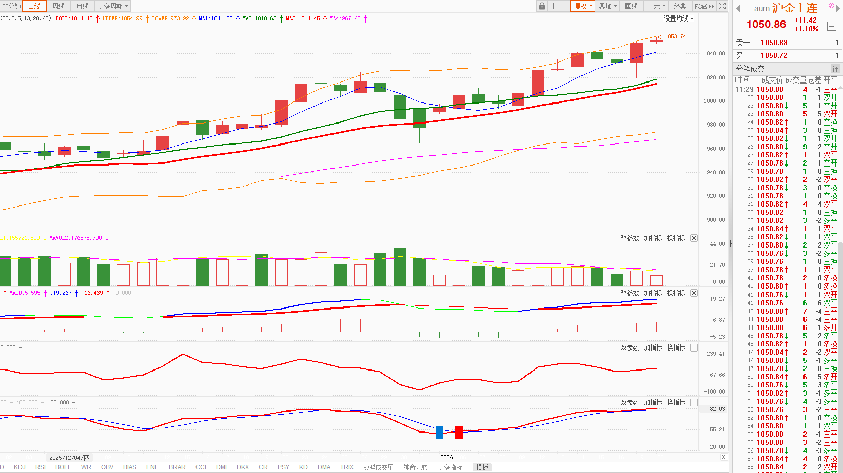 沪金主连:涨1.10%,日K线在5日均线之上。今天沪金继续上涨,再创新高,目前仍为上升走势,技术指标已高位钝化,也可能随时出现震荡,长期投资可持基观望,做波段的可适量高抛低吸。司机今天不动,暂时观望。