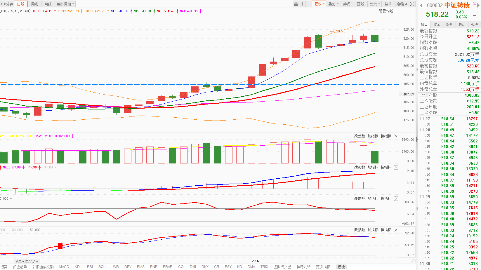 中证转债:跌0.66%,日K线在5日均线之下附近,KDJ死叉,MACD金叉红柱缩短。今天中证转债下跌,日K线小破5日均线,表现较弱。司机昨天说可转债在消化前面的那根大阴线时挺费劲,一根阴线4天收不回,如不能向上突破,后市仍有可能继续震荡,今天果然又回调了。