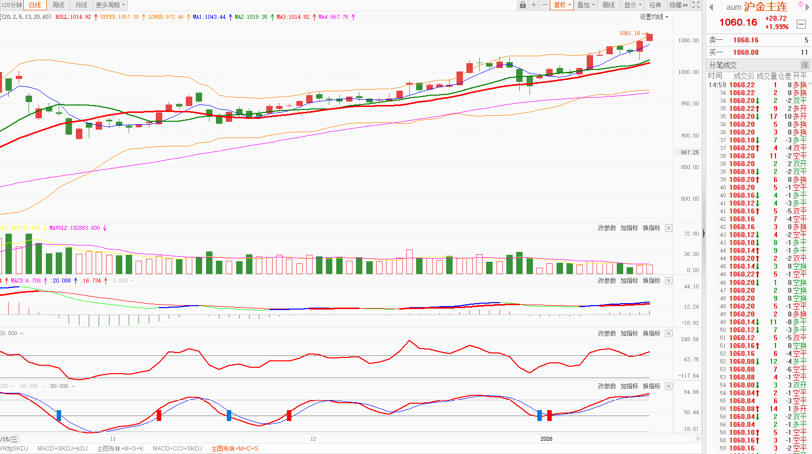 沪金主连:涨1.99%,日K线在5日均线之上。今天沪金继续大涨,再创新高,日K线站上布林线上轨,目前较为强势,后市仍有可能继续上行,但高位大涨,也可能随时出现震荡,长期投资可持基观望,做波段的可适量高抛低吸。