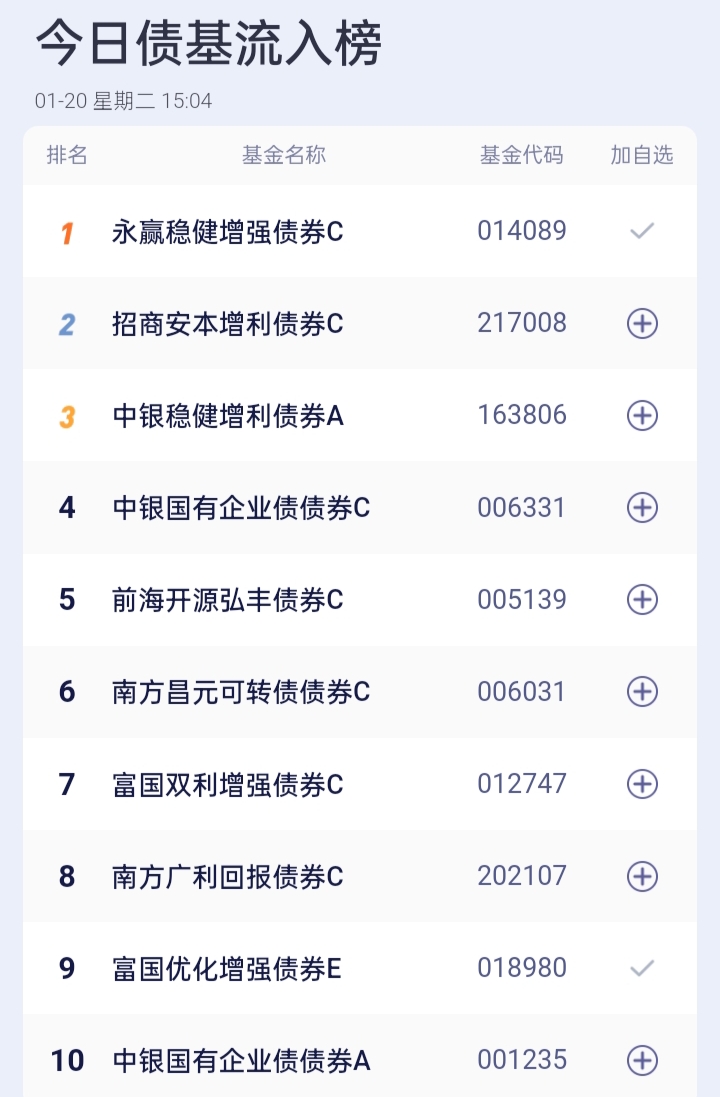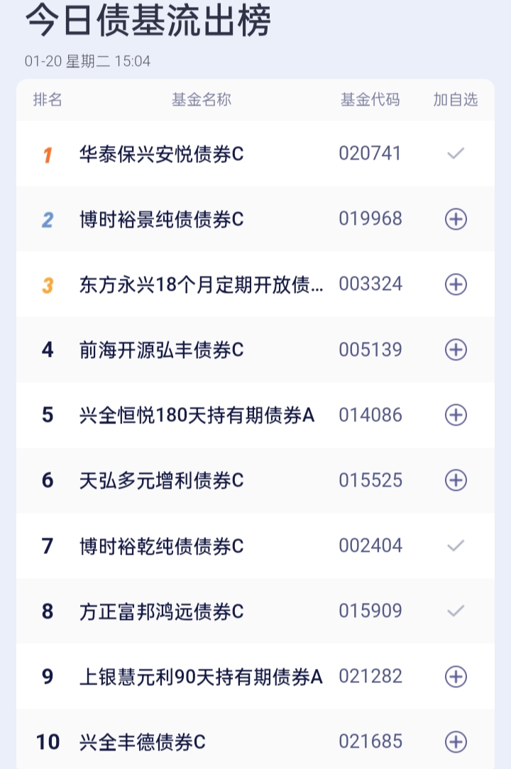 $易方达增强回报债券A(OTCFUND|110017)$。$华泰保兴安悦债券A(OTCFUND|007540)$。$永赢稳健增强债券C(OTCFUND|014089)$。$东方添益债券(OTCFUND|400030)$。$方正富邦鸿远债券C(OTCFUND|015909)$。$长城短债C(OTCFUND|007195)$。$广发中债7-10年国开债指数E(OTCFUND|011062)$。$博时恒乐债券C(OTCFUND|014847)$。$鹏华丰禄债券(OTCFUND|003547)$。$博时恒乐债券A(OTCFUND|014846)$