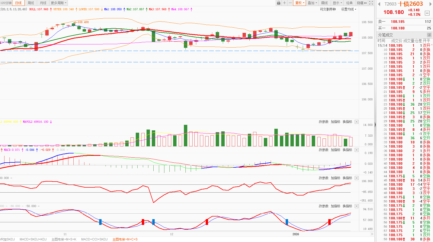 今天国债期货日K线收盘后全部在5、10日均线之上,2、5、10年国债期货日K线收盘后在5、10、20日均线之上,整体走势较强。