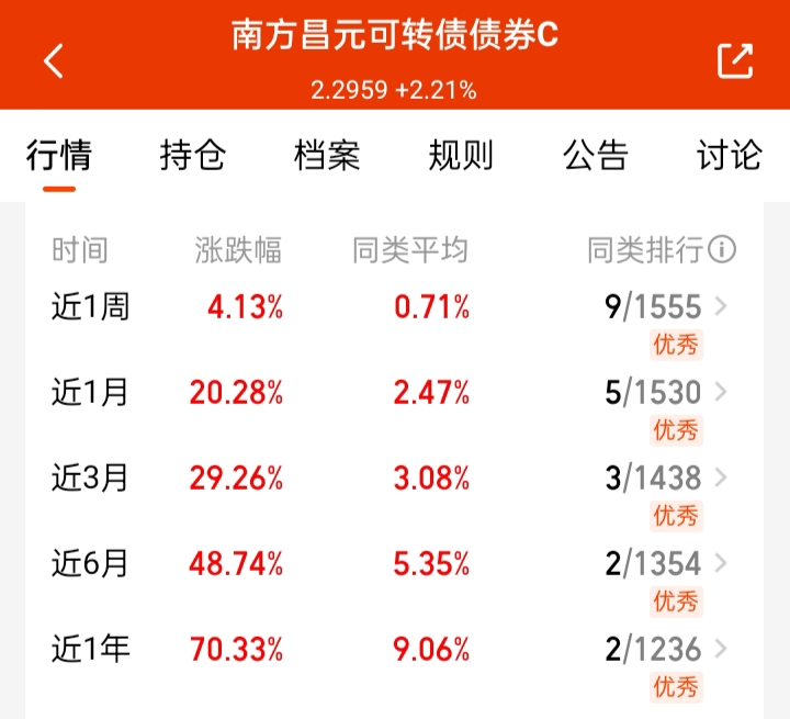 南方昌元正是聚焦可转债赛道的典型产品。它采用高弹性可转债策略,近3月上涨29.26%,近6月上涨48.74%,近1年涨幅达70.33%,均是同类平均的8倍以上,超额收益显著。A、C类收益包揽同类前第一、第二名,表现太亮眼了。多阶段业绩持续跑赢同类,验证了可转债在震荡市中的配置价值。