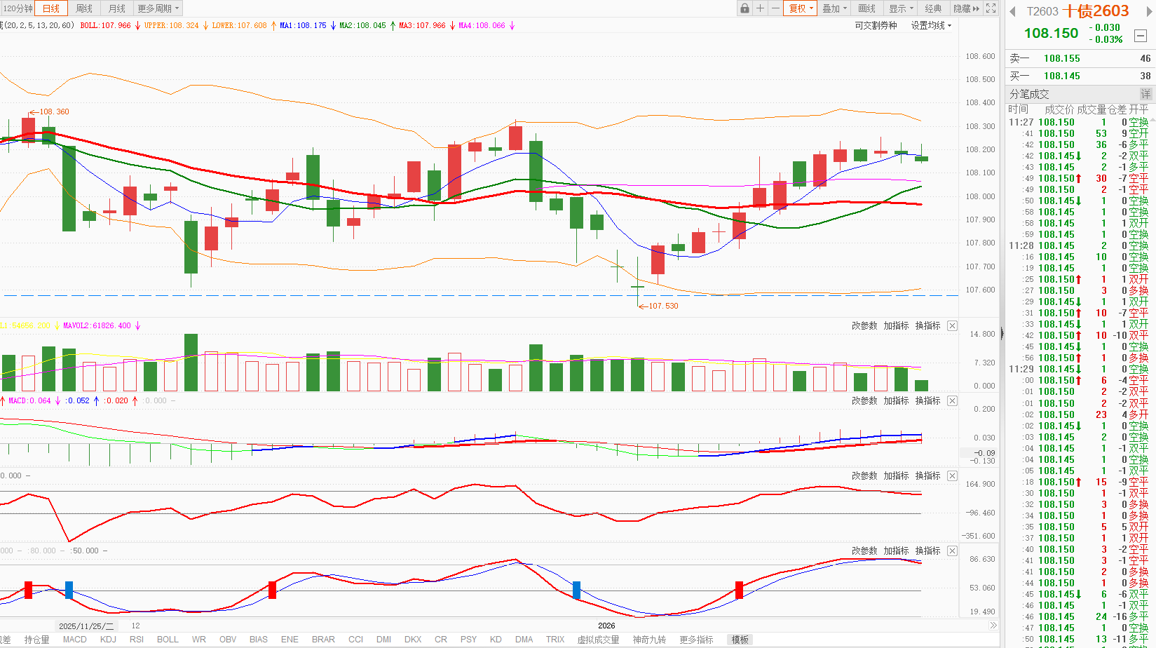 今天国债期货日K线收盘后全部在5日均线之下,整体走势偏弱。