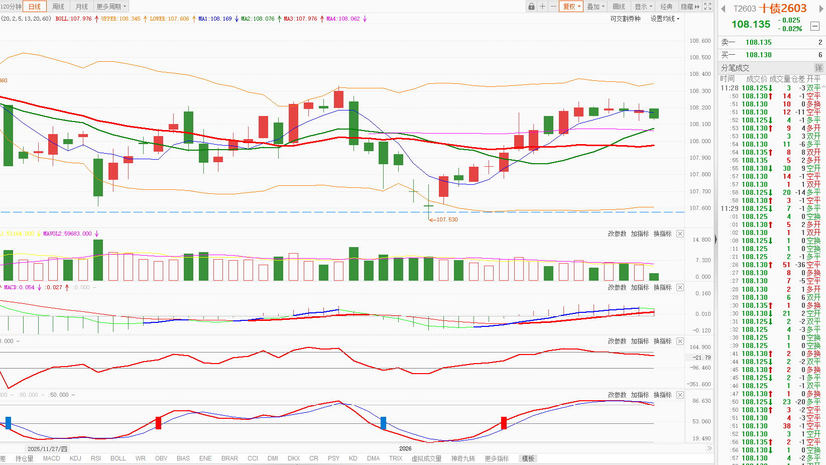 今天国债期货日K线收盘后全部在5日均线之下,整体走势震荡偏弱。