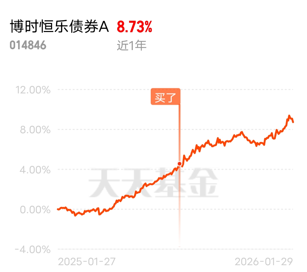 最近这市场,固收+产品真是挺吃香的。$博时恒乐债券A$ 债券这块儿稳稳的,股票部分还能博点超额收益,两手配合得不错。今年不知不觉攒了150多个蛋了,近一年收益超过8.7%,这赚钱能力是实打实的。1月29日央行开展了3540亿元7天期逆回购,而且整个1月MLF都是大额净投放,节前流动性直接拉满,银行间资金利率回落,主要利率债收益率普遍下行,10年期国债活跃券收益率已到1.8%附近了。在这种流动性宽松的环境下,债券收益有保障。更惊喜的还是它的权益仓,完全超出了我的预期,选股还特别精准,除了非银金融,还布局了资源品和周期股的龙头,如万华化和铜陵有色,最近资源品板块可是迎来了大爆发,国际大宗商品涨价,新能源和AI算力对资源的需求激增,万华化学作为化工龙头,业绩稳健,铜陵有色更是受益于有色金属板块的量价齐升,这几只票近期都有不错的涨幅,直接给基金的收益添了一把火。现在市场风格已经转向价值投资,这基的权益仓布局的都是业绩确定性强、估值安全的龙头股,债券部分又能享受流动性宽松的红利。我的打法很简单,认准了的基,回调超过半个点就加点仓,积攒低价筹码。#4200点久攻不下 盘整十日何去何从?#