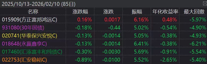 拉了一下快4个月的业绩,发现鸿子业绩是红的,而且鸿子的最大回撤还不是最大的,不就说明了在过去一段时间股市上去的时候鸿子通过配置一些利率+策略可以做到一些增强和对冲,让自己的收益领先纯超长债。