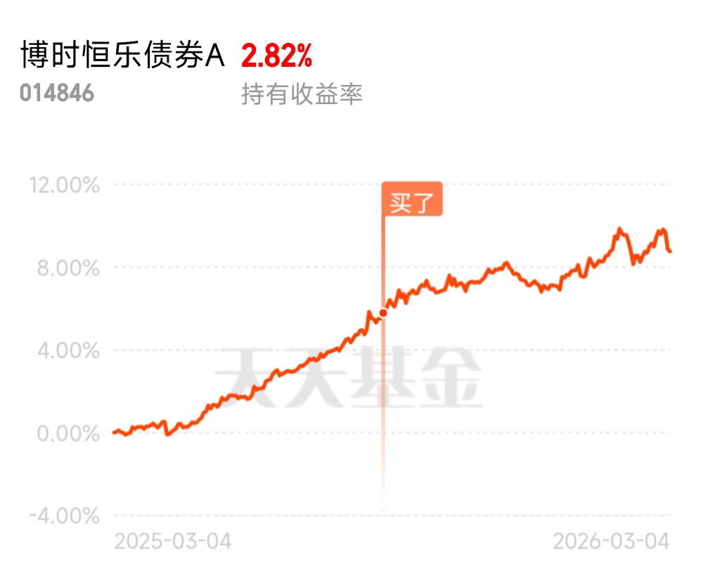 昨天市场一片绿,跌得有点凶,但$博时恒乐债券A$ 表现还挺稳的,回撤控制得不错。近一年默默攒下了876个蛋,长期业绩很是能打。这基配置上债券是大头,稳;股票选龙头,空间大,这波市场调整,感觉是不错的布局时机。博时这基的债券底仓,简直就是定心丸一样的存在,不管是去年年底债市小震荡,还是今年年初股市波动,它都稳稳当当,净值曲线相当平滑,基本没有大起大落的心跳感。这基聚焦中短端高等级信用债,按最近的市场行情,中短端债在央行流动性呵护下抗波动能力超强,信用利差维持低位,票息收益稳定,这就也是它长期稳健上涨的核心底气,比存银行定期香太多,流动性还更好。这基不仅债券能打,权益仓位更是惊喜彩蛋,前十大权益里有中国平安、中信证券这类金融龙头,精准踩中当下热点。中央金融工作会议一直在强调做好“五篇大文章”,金融股作为核心受益板块,政策支持力度拉满,而且2025年末金融“五篇大文章”贷款余额同比增长12.9%,融资成本下降,银行、券商的盈利预期都在提升,中国平安和中信证券作为行业龙头,估值不高,长期向上逻辑超清晰。#一马当先,投赢开年#