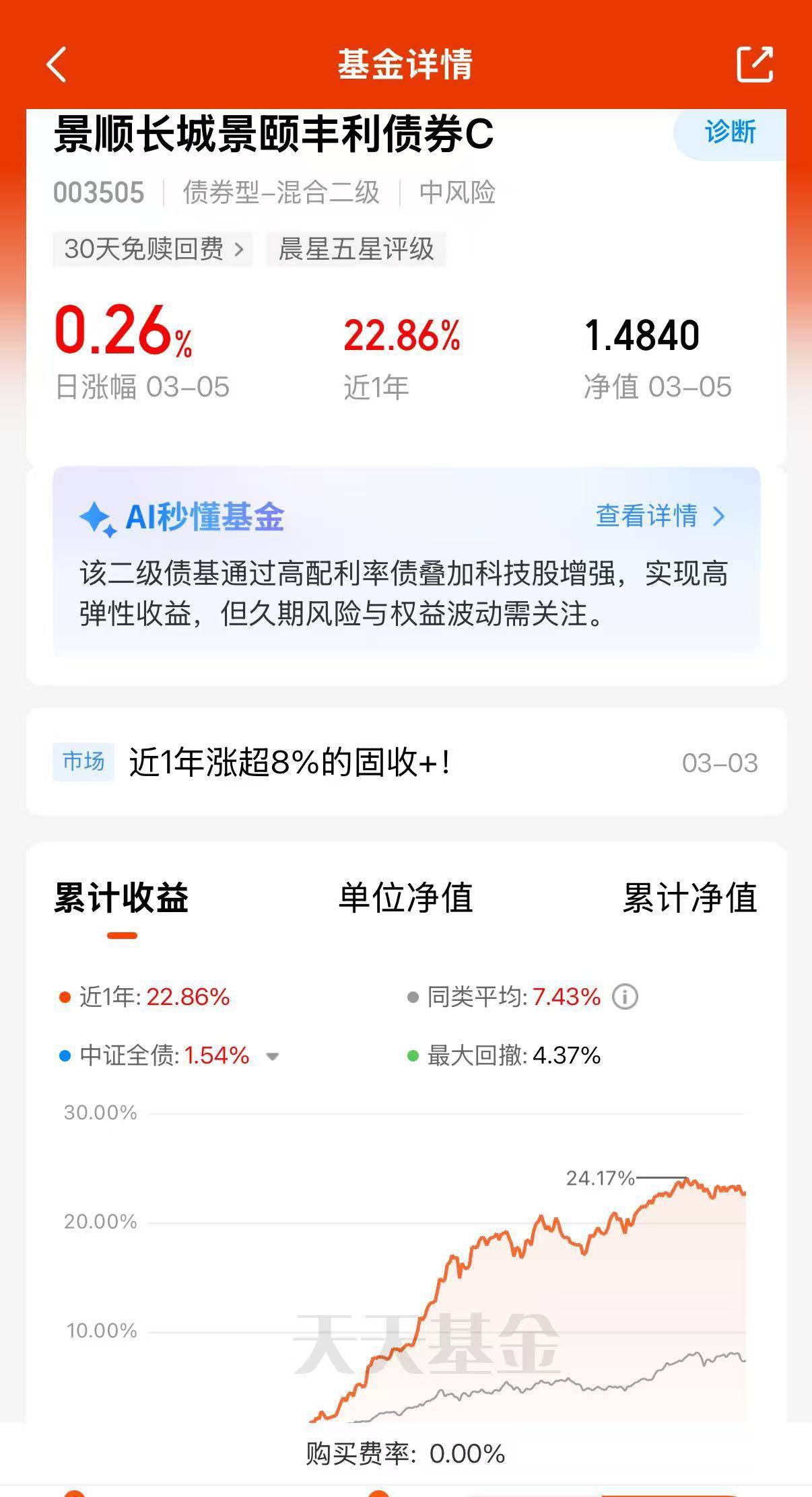 科技混债基真的回来了!昨天 AI 算力带头冲,景顺长城景颐丰利债券 C跟着吃了大肉,日涨 0.26% 领跑同类。近一年 22.85% 的收益,稳中带猛,现在布局不亏。$景顺长城景颐丰利债券C$