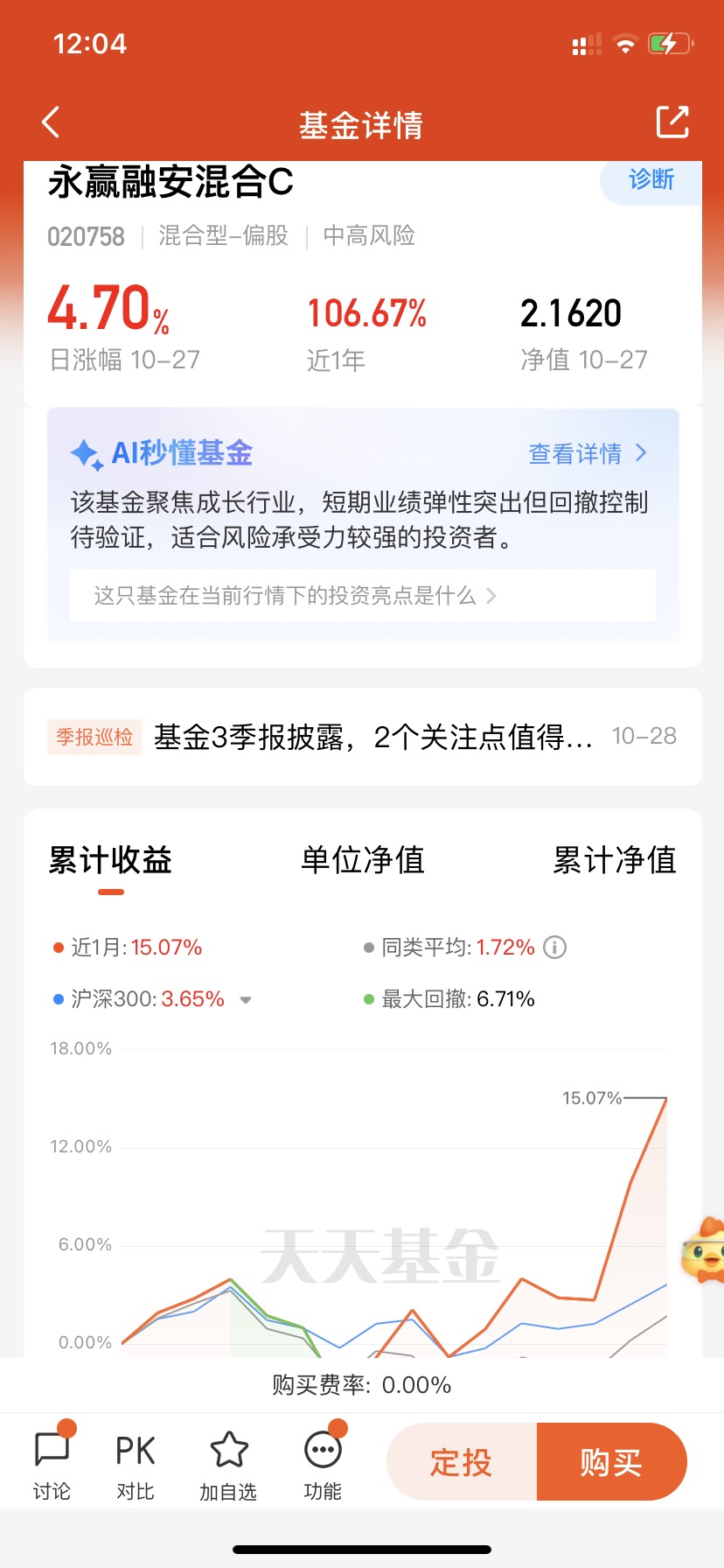 $永赢融安混合C$ 聚焦成长行业,昨天涨了4.70%,两天涨了11.73%回来,近三个月45.58%涨幅,近半年96.89%涨幅,各个阶段业绩表现都很优秀,短期业绩爆发力很强,稳健向上啊!本季度买的量子和CPO,怪不得涨势这么凶猛,基金经理高楠的选股能力和逆向思维确实很强,值得期待了!#15连阳!农行总市值逼近2.9万亿#