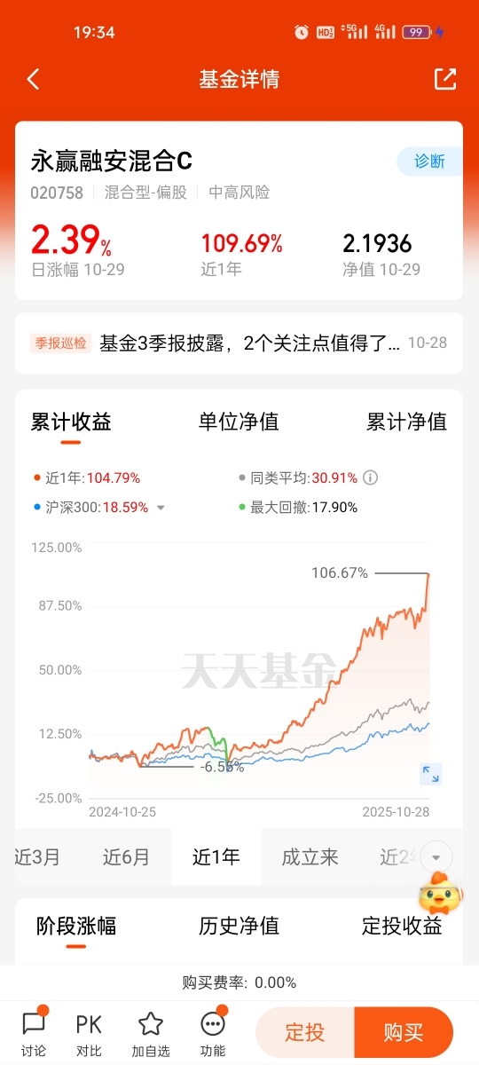 这一波上涨行情不要乱动要拿稳吃肉了,在十五五利好的带动下行情还会一直持续上涨的,在社区找到一只翻倍基,永赢融安C020758,这基金买的是量子和CPO,近一年收益率109.69,基金经理高楠,被誉为选股大神,跟他买比我自己操作赚得多。