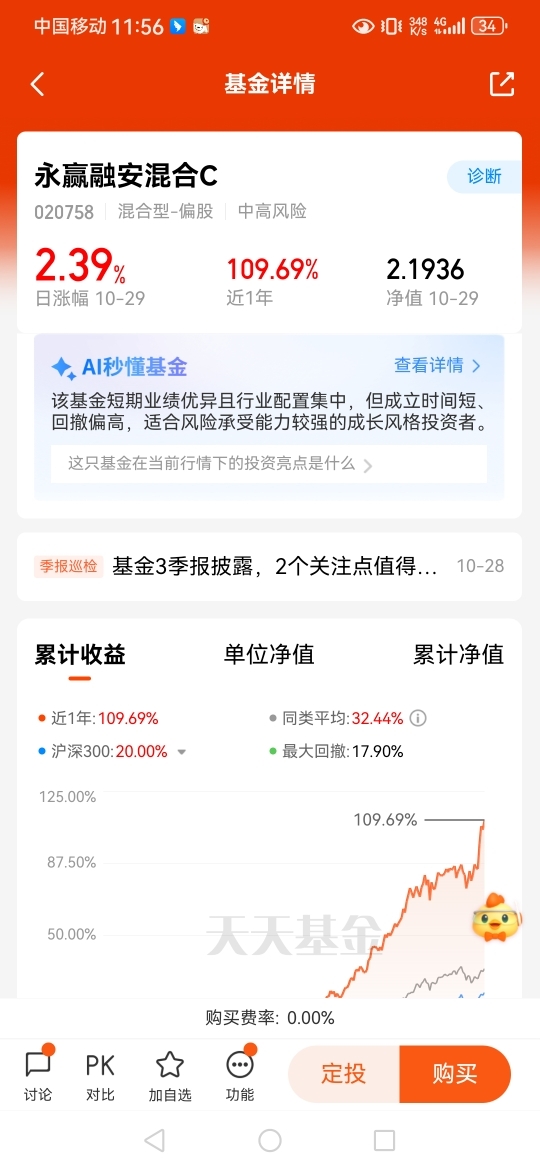 $永赢融安混合C$ 聚焦通信、医药生物等成长性行业,采用大盘平衡风格。短期业绩表现亮眼(近1年收益排名前1.13%),但回撤控制(最大回撤17.90%)及成立时间较短的特征需结合投资来说看呐,昨日上涨+2.39%,近一年涨幅+109.69%#慢慢投基路 你悟出了哪些投资哲学?#
