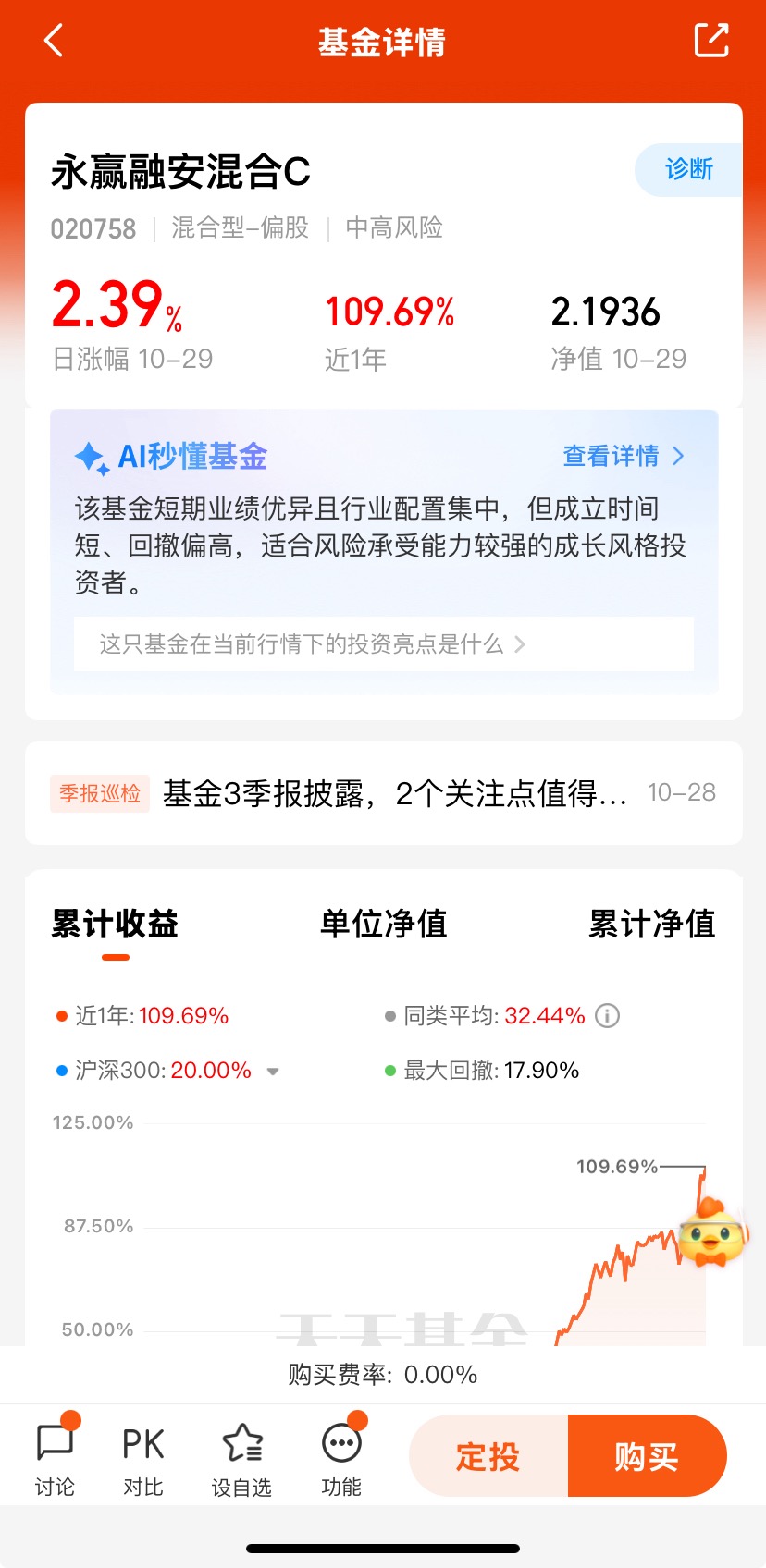 #A股突破4000点!下个目标位在哪?# $永赢融安混合C$ 昨天上涨2.39%,近一周收益13.55%,近三个月收益39.59%;近六个月收益99.73%,今年以来净值增长109.69%,在同类基金中表现突出。基金经理高楠具有丰富的投资经验,通过分散投资多个行业,降低单一行业的风险,提高基金的抗风险能力。近期市场情绪较为乐观,消费电子、医药生物、通信设备等板块表现活跃,为基金净值增长提供了支撑。